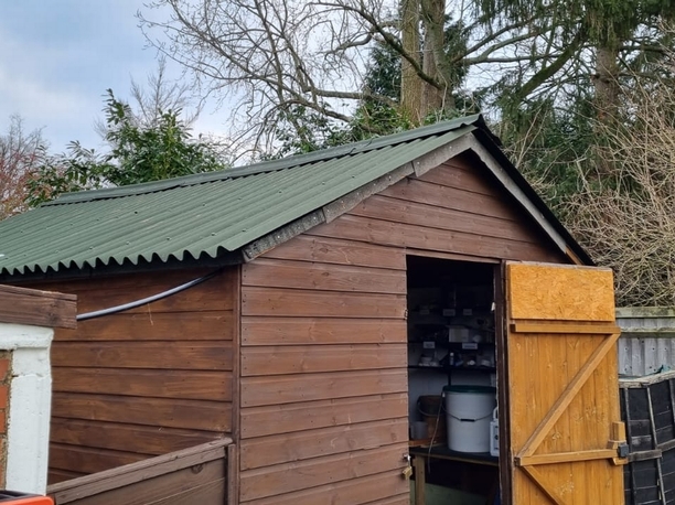 The shed which had been re-felted in the last 5 years, now has a new ribbed bitumen roof thanks to the knowledge and assistance of Peter Lewis who had undertaken a similar job at home.